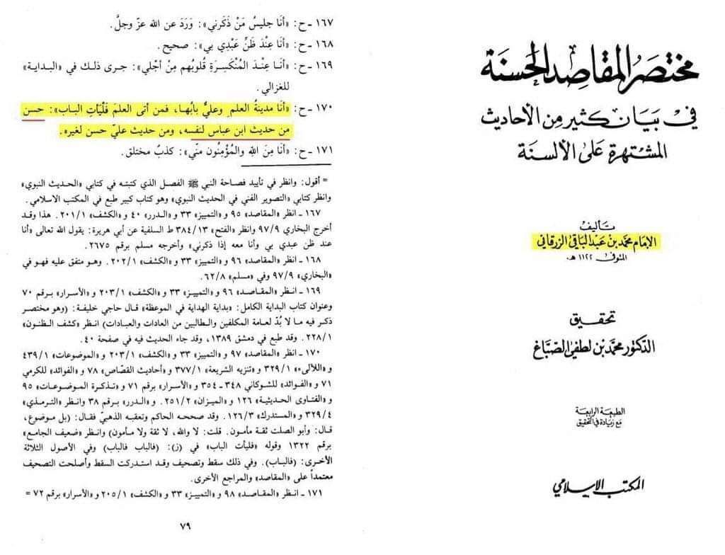 4- रसूल अल्लाह ﷺ ने फ़रमाया:- मैं (ﷺ) इल्म का शहर हूं और अली (عَلَیهِالسَّلام) उसका दरवाज़ा। (मुख़्तसर मक़ासिद हसना, सफ़ाह 79)