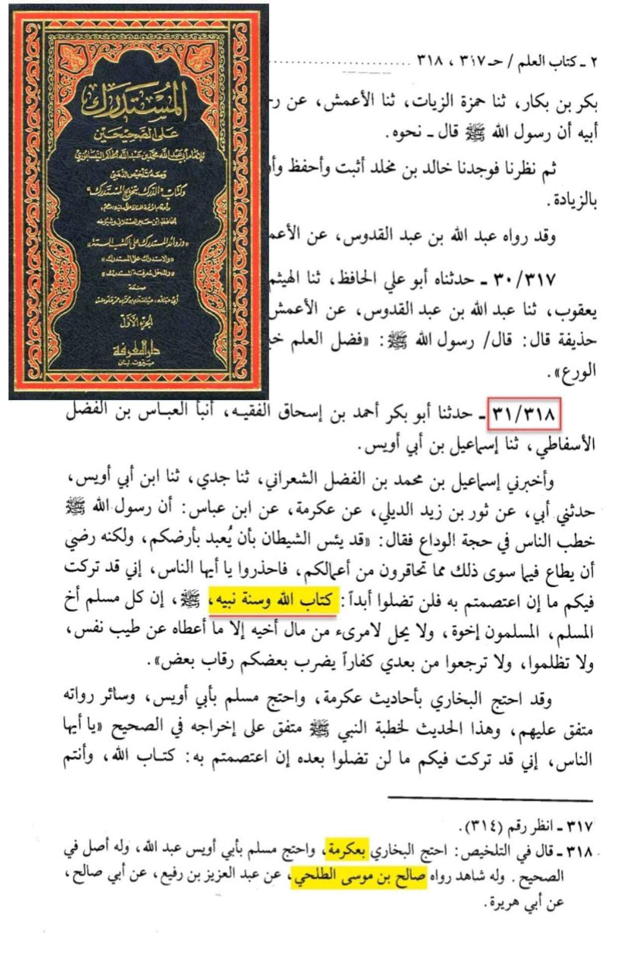 इमाम हाकिम निशापुरी ने मुस्तदरक अलस्-सहीऐन में जो हदीस नक़ल की है जिसके सही सनद होने पर इमाम हाकिम निशापुरी और इमाम शमशुद्दीन ज़हबी ने सही कहा है..यह हदीस इमाम इब्ने असाकिर की तारीख ऐ मदीना ऐ दमिश्क में, इमाम मुत्तकी हिंदी की कंज़ुल-उम्माल में और कई किताबों में दर्ज है.. जैसे कि कुछ मिसाल यहां मौजूद है 👇