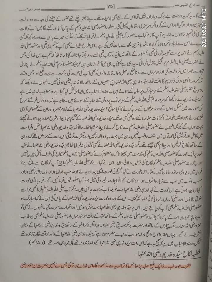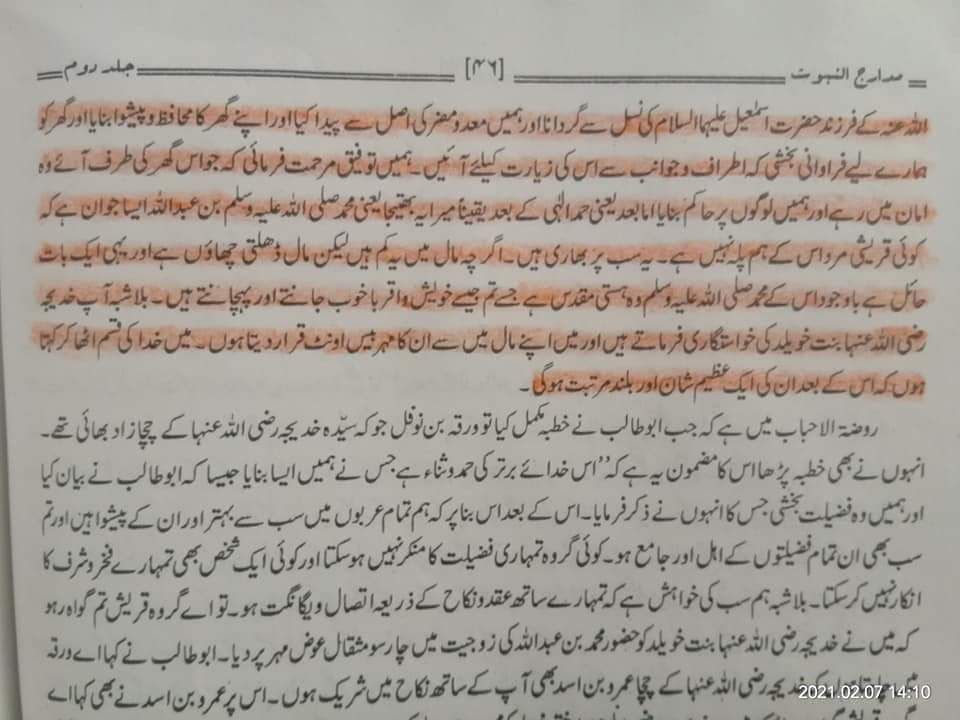 अब्दुल हक़ मोहद्दिस देहलवी रह० ने मदारुजुन्नबूवत में लिखा है कि अबू तालिब ع ने जब हज़रत खदीजा सलामुल्लाह अलैहा का निकाह मोहम्मद ﷺ से कराया और ख़ुतबा पढ़ा तो उसमें अबू तालिब ع ने अल्लाह ﷻ का शुक्र अदा करते हुए दावा किया कि मैं आले इब्राहीम से हूं….और मुझे हज़रत इस्माईल ع की नस्ल में पैदा किया और मुझे अपने घर यानि काबा का मुहाफ़िज वा पेशवा बनाया।