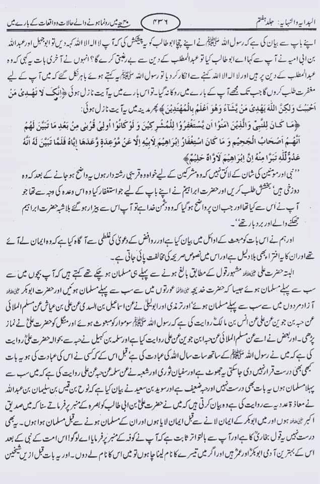 इब्ने हिशाम में लिखा है, जिसका मफ़हूम यह है कि एक बार हज़रत मोहम्मद ﷺ के साथ मौला अली ع अपने बचपन में नमाज़ पढ़ रहे थे फ़िर अबू तालिब ع अपने भतीजे और बेटे की तलाश में बाहर निकले…