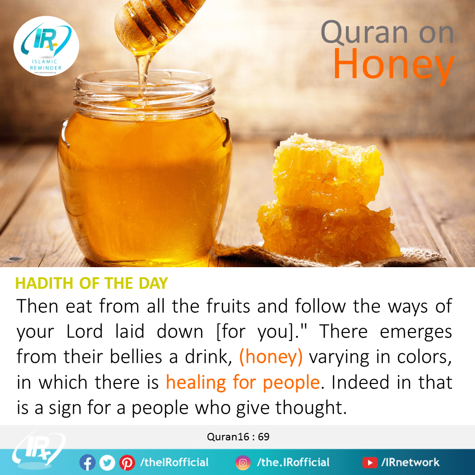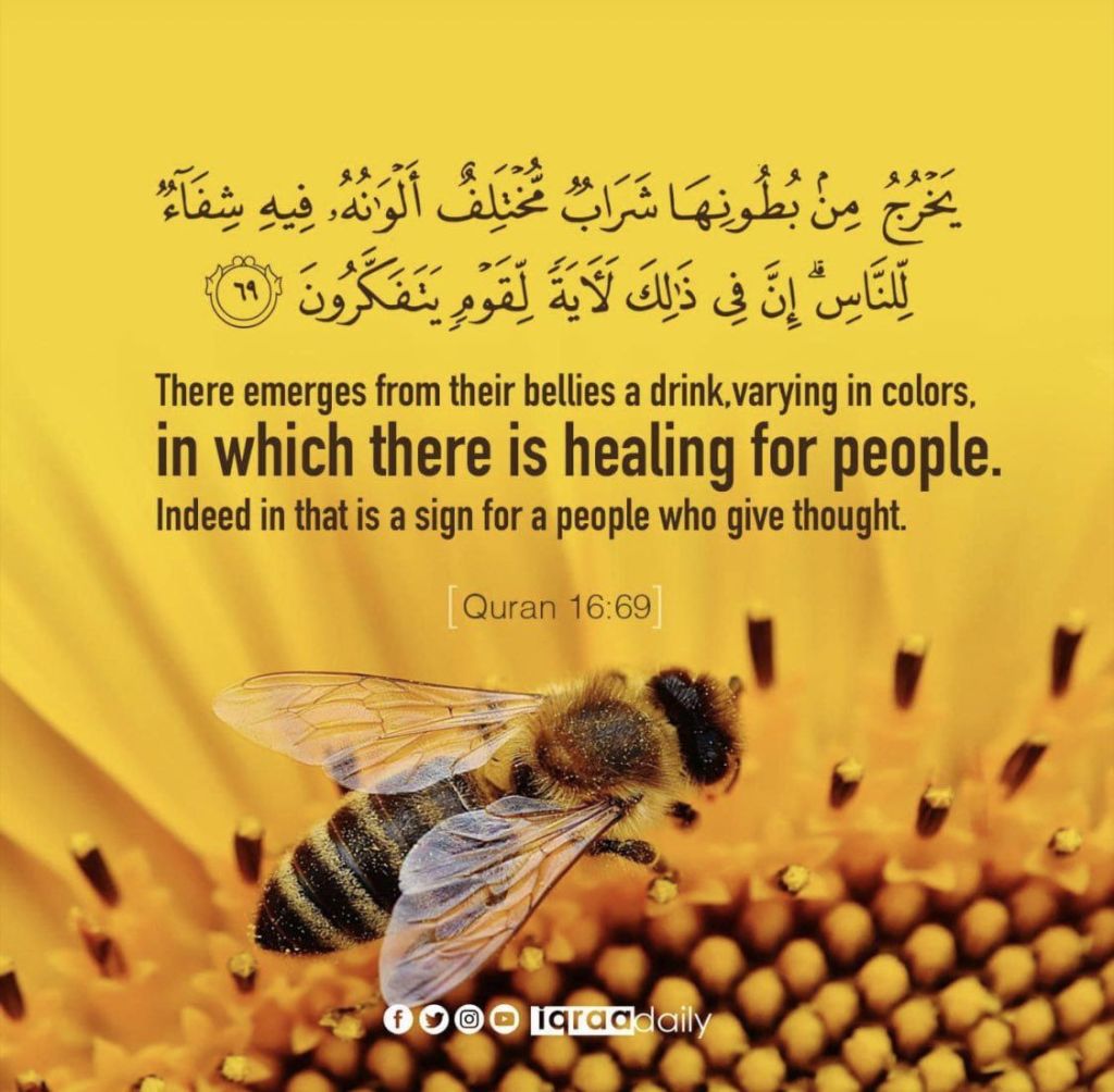 The God Says” God inspired bees to live in mountains, trees and that they construct. Ten eat from fruits and follow the ways of the God. Hence comes out of their bellies, syrup of different hues, in which there are cure for people. In this there is a proof of those who think deeply”.” (Nahl:68-69).