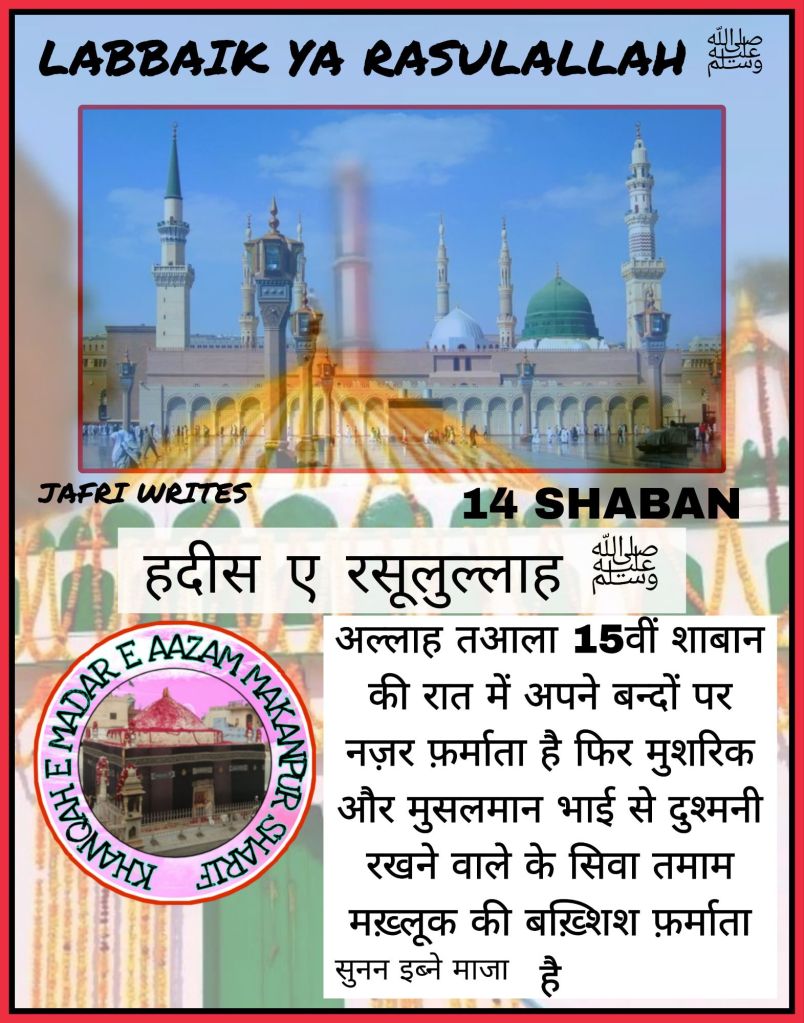 *Huzoor Nabi e Kareem ﷺ Ne Irshad Farmaya Jab Nisf Shaban Ki Ya’ani (15 Shaban) Ki Raat Aaye To Raat Ko Qayaam Ya’ani Ibadat Karo Aur Din Ko Roza Rakho, Beshak Ghuroob e Aaftab Se Subah Sadiq Tak Allah Ta’ala Ki Rehmat Ka Khaas Nuzool Aasman o Duniya Par Hota Hain, Allah Ta’ala Ki Taraf Se Aawaz Di Jaati Hai :- Khabardar! Hai Koi Mujhse Bakhshish Talab Kare Me Use Baksh Du, Hain Koi Rizq Ka Talib Ke Use Rizq Ata Karu, Hain Koi Musibat Zada Ke Me Use Aafiyat Ata Karu, Khabardar, Koi Is Tarah Hai ? Khabardar Koi Is Tarah Hai ? Isi Tarha Ek Aur Hadees Hain Huzoor Nabi e Kareem ﷺ Ne Irshad Farmaya :- Beshak Nisf Shaban Ki Raat Me Allah Ki Rahmat Ka Khaas Zahoor Hota Hai, Allah Apni Tamaam Makhlooq Ko Maaf Farma Deta Hain Siwa e Mushrik, Logo Se Bughz Rakhne Wala Aur Dushmani Karne Wale Ke, Huzoor Nabi e Kareem ﷺ Ne Irshad Farmaya Ki Allah Ta’ala Shaban Ki 15wi Raat Ko Apni Tamaam Makhlooq Ki Taraf Mutawajjeh Hota Hain Aur Tamaam Makhlooq Ki Maghfirat Farma Deta Hain Lekin Mushrik Aur Bughz (Keena) Rakhne Wala Nahi Baksha Jata, Huzoor e Akram ﷺ Ne Irshad Farmaya :- Nisf Shaban Ki Raat Me Saal Bhar Me Paida Hone Wale Aur Faut (Intaqal) Hone Wale Baa’is e Rif’at Naik Aamal Aur Rizq Ke Asbaab Likh Diye Jate Hain, Ek Aur Hadees Hain Huzoor Nabi e Kareem ﷺ Ne Farmaya Jab 15 Shaban Ki Shab Aaye To Usme Ibadat Karo Din Me Roza Rakho, Allah Paak Shaban Ki 15wi Shab Me Tajalli Farmata Hai Istagfar (Tauba) Karne Wale Ko Baksh Deta Hai, Huzoor Nabi e Kareem ﷺ Shaban Ki 15wi Raat Me Aadhi Raat Ko Qabarustan Tashreef Le Jate The, Huzoor ﷺ Ne Irshad Farmaya Jisne 15wi Shaban Ko Roza Rakha Usko Meri Shafa’at Halaal Ho Gayi, Jo Shaks 15wi Shaban Ko Roza Rakhe Use Jahannum Ki Aag Na Chuegi.*