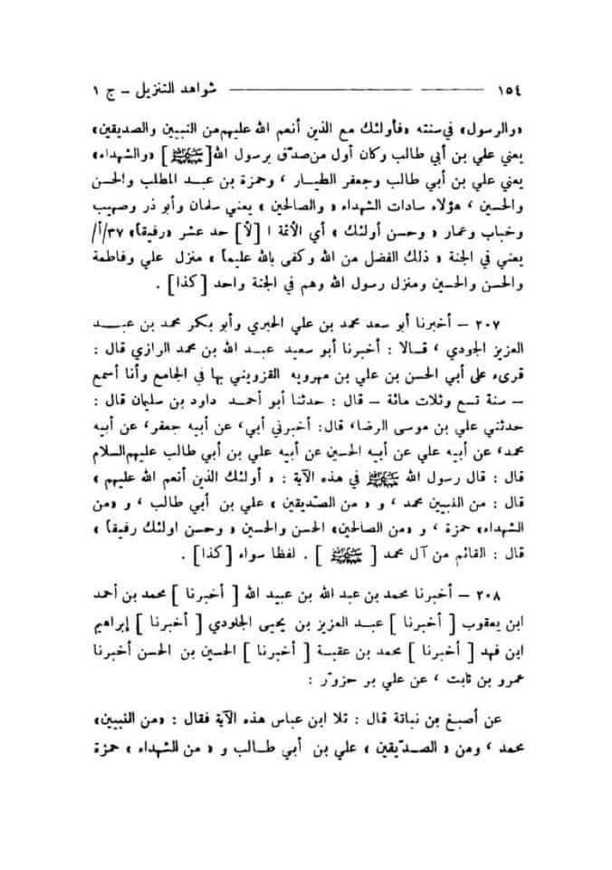 Hazrat Ibn Abbas RadiAllahu Anhu Surah Nisa Ki Aayat Number 69 ومن يطع الله والرسول فأوليك مع الذين أنعم الله عليهم من النبين والصديقين والشهداء والصلحين وحسن أوليك رفيقا “Jo Log Allah Aur Uske Rasool Ki Ita’at Karte Hein Ye Log Qayamat Mein Unke Sath Honge Jinpar Allah Ne Inam Farmaya Jo Ke Ambiya Siddiqin Shuhada Aur Saliheen Hain Aur Ye Bohot Ache Saathi Hein” Ki Tafseer Mein Farmate Hain Allah Ki Ita’at Se Murad Farz Ibada’at Hai Aur Rasool Ki Ita’at Se Murad Sunnate Rasool Hai, Aur Ambiya Mein Sab Nabi Shamil Hain Jaise Muhammad Sallallahu Alaihi Wa Aalihi Wasallam Aur Siddiqin Se Murad Sacche Afrad Hain Jaise Maula Ali Jinhone Sabse Pehle Rasoole Khuda Par Imaan Laye Aur Aapki Tazdeeq Ki Aur Shuhada Se Murad Shaheed Hain Jaise Ke Ali, Hamza, Jafar, Hasan, Hussain Alaihimussalam Aur Saliheen Se Murad Naik Hain Jaise Ke Salman, Abu Zar, Ammar,Suhayb, Khabbab Aur Hasan Rafeeqah Se Murad Jannat Mein Ek Jagah Rehne Wale Saathi Hain Jaise Ke Fatima, Ali, Hasan, Hussain Alaihimussalam.