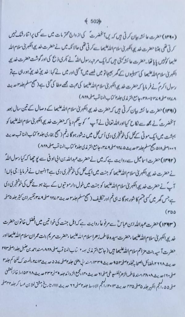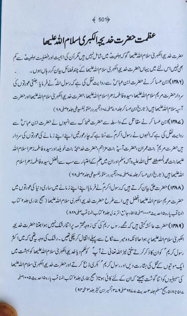 हज़रत अली عَلَیهِالسَّلام बयान करते है मैंने रसूल अल्लाह ﷺ को फ़रमाते सुना अपने ज़माने में मरियम बिन्ते इमरान सबसे बेहतर ख़ातून थी और इस ज़माने में हज़रत ख़दीजा س सबसे बेहतरीन ख्वातीन है