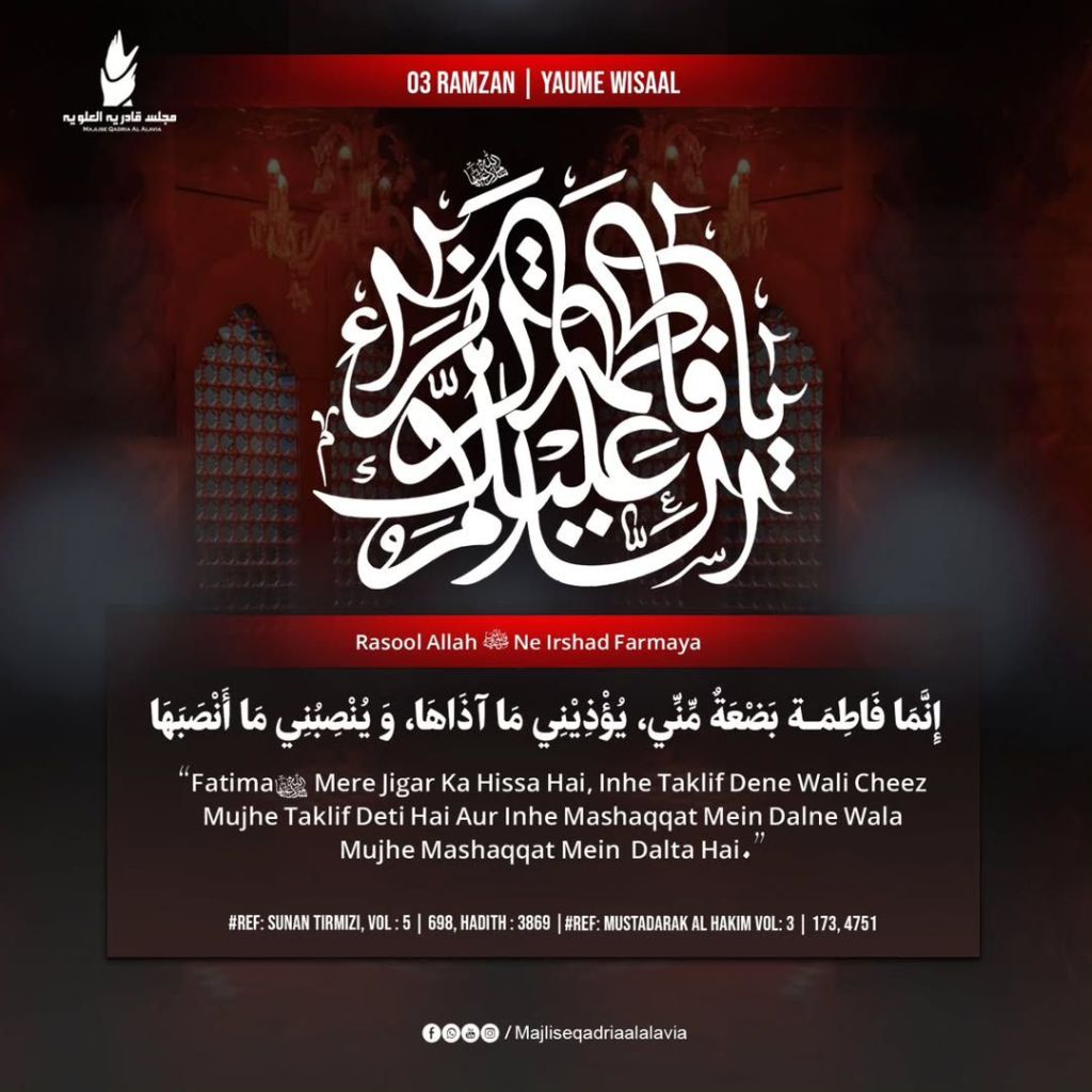 Hadith:Bibi Fatima AlaihisSalam Nabi Pak ke jigar ka hissa hai. March 12, 2025 aal-e-qutub Share this: Click to share on X (Opens in new window) X Click to share on Facebook (Opens in new window) Facebook Click to print (Opens in new window) Print Click to share on Pinterest (Opens in new window) Pinterest Click to share on WhatsApp (Opens in new window) WhatsApp Like Loading... Related Published by aal-e-qutub View all posts by aal-e-qutub