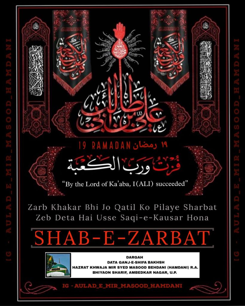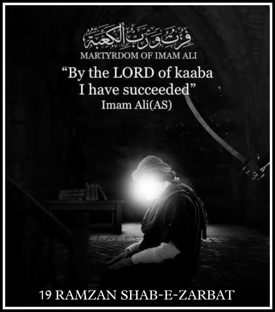 *जब उस लईन मलऊन की तलवार आपके सर ए अक़दस पे लगी, आपकी ज़ुबां ए पाक से अल्फ़ाज़ निकले ” रब्बे काबा की कसम मैं कामयाब हो गया” 19 रमज़ान की रात को इसीलिये शब ए ज़रबत कहते है।*