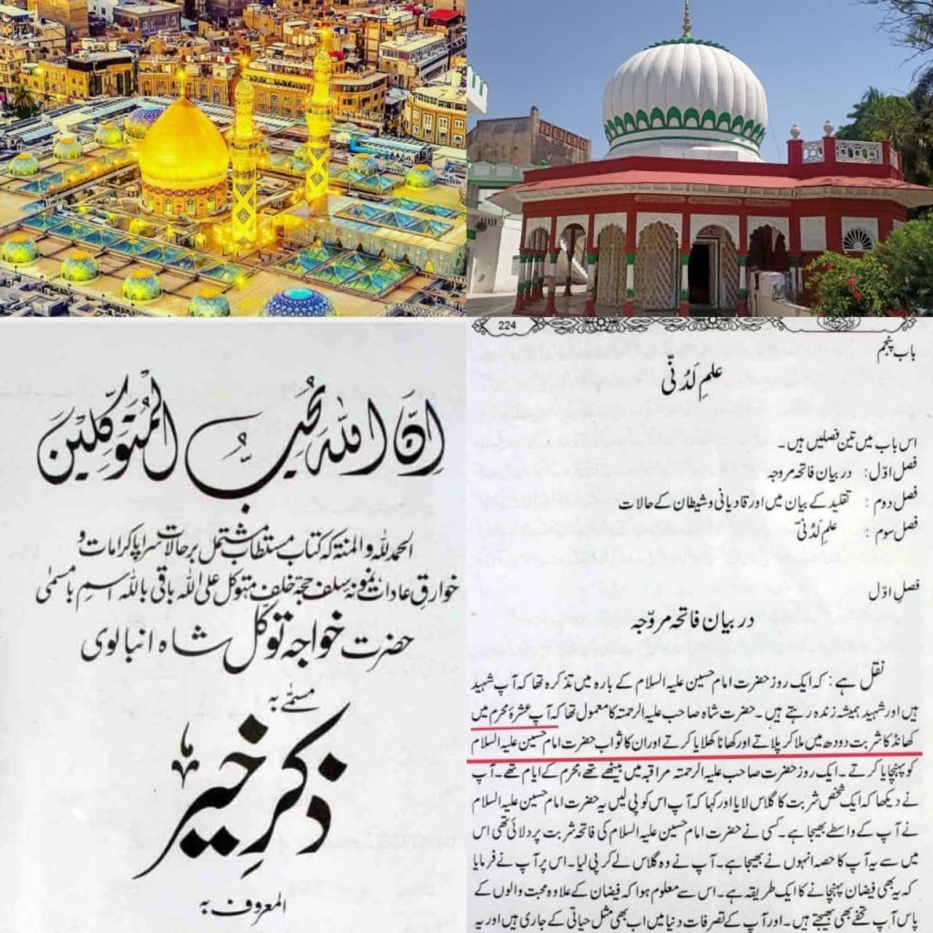 Hazrat Shah Sulaiman Phulwari Chishti Qadri Rehmatullah Alaih Jo Hazrat Baba Fareeduddin Masood Ganj Shakar Rehmatullah Alaih Ki Nasal Se Hain Aur Mureed o Shagird Ghous e Zama’n Hazrat Fazle Rehma’n Ganj Muradabadi Rehmatullah Alaih Ke Hain Aur Khalifa Hazrat Haji Imdadullah Muhajir Makki Rehmatullah Alaih Ke Hain Wo Apni Kitab Gham e Hussain Me Likhte Hain :- Hazrat Baba Fareeduddin Masood Ganj Shakar Se Manqool Hain Ke Baghdad Sharif Me Ek Buzurgh The Jinke Samne Hazrat Imaam Hussain Ki Shahadat Ka Zikr Hua Wo Is Qadar Roye Ke Rote Rote Zameen Par Sar De Mara Aur Unka Sar Phat Gaya Jiski Wajah Se Unka Wisal Ho Gaya, Usi Raat Logo Ne Unko Khuwab Me Dekha Aur Haal Poucha To Farmaya :- Mene Ahle Baith Ki Muhabbat Me Apni Jaan Dedi Thi Isliye Khuda Ne Mujhko Baksh Diya Aur Me Hazrat Imaam Hussain Ke Saath Rehta Hu. Aur *Khud Hazrat Baba Fareeduddin Masood Ganj Shakar Bhi Aashura Ke Din Karbala Ki Yaad Me “Hay Hay” Ka Nara Lagate Aur Behosh Ho Jate The.*