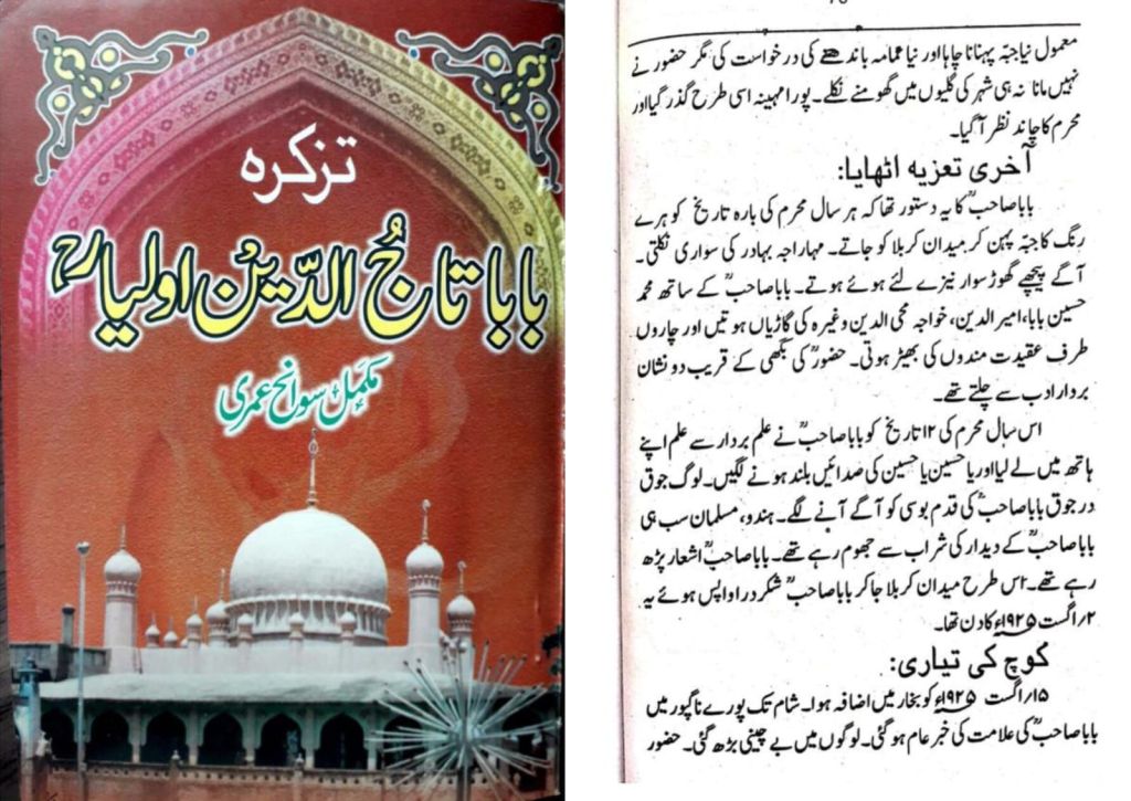 Hazrat Baba Tajuddin Nagpuri Ka Ye Dastoor Tha Ke *Har Saal Muharram Ki 12 Tareekh Ko Hare Rang Ka Jubba Pehan Kar Maidan Me Jate The* Baba Sahab Ke Sath Muhammad Hussain Baba, Ameeruddin, Khawaja Mohiuddin Wagera Ki Gadiyan Hoti Aur Charo Taraf Aaqidat Mando Ki Bheed Hoti Huzoor (Baba Tajuddin Nagpuri) Ki Baggi Ke Kareeb Do Nishan Bardar Adab Se Chalte The, *Is Saal Muharram Ki 12 Tareekh Ko Baba Sahab Ne Alam Bardar Se Alam Apne Hath Me Liya Aur Ya Hussain Ya Hussain Ki Sadai Buland Hone Lagi* Log Zauk Dar Zauk Baba Sahab Ki Qadambosi Ko Aage Aane Lage, Hindu Musalman Sab Hi Baba Sahab Ke Deedar Ki Sharaab Se Jhoom Rahe The Baba Sahab Ashaar Padh Rahe The *Is Tarah Maidan e Karbala (Nagpur Ki Karbala) Jakar Baba Sahab Wapas Hue* Ye 2 August 1925 Ka Din Tha.