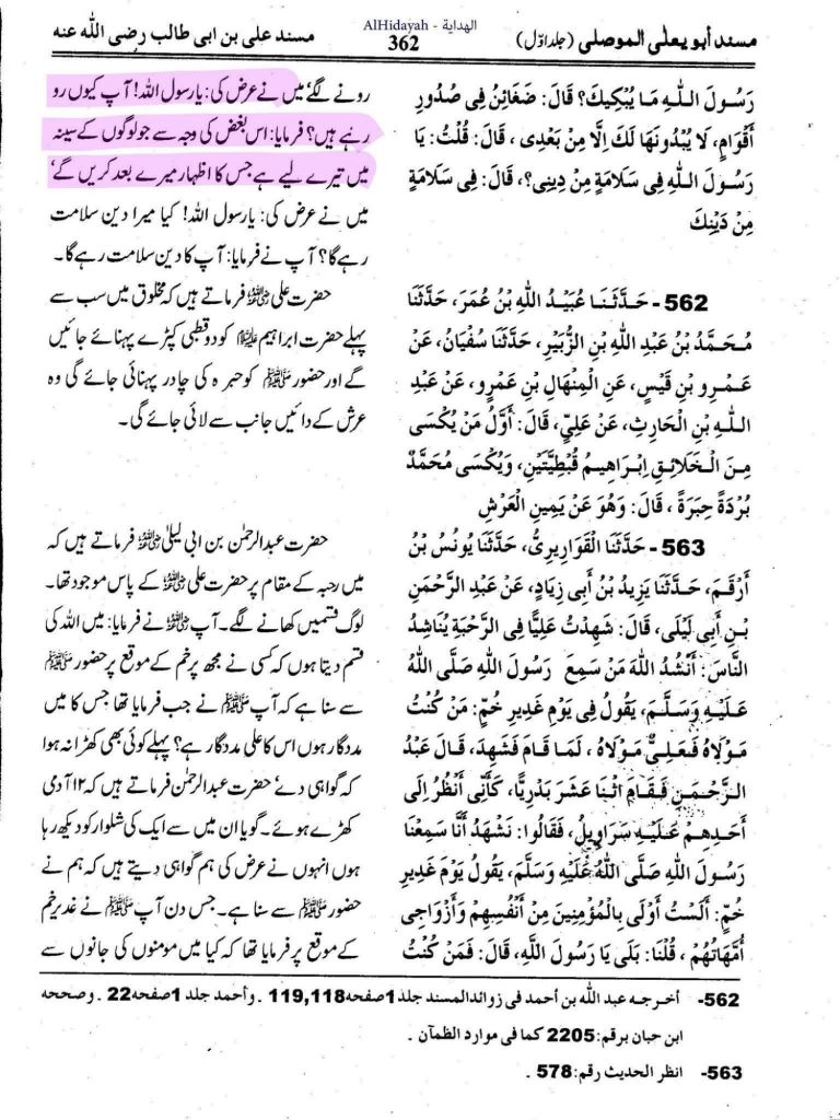 नोट_ सवाल ये है उस वक्त कौन लोग हयात थे कौन बाद में बुग्ज जाहिर करने वाले थे याद रहे अगर काफ़िर थे तो उन्हें दिल ही दिल में हुज़ूर ﷺ के हयात में बुग्ज रखने कि जरूरत नहीं थी यक़ीनन वो कलमा पढ़ने वाले ही लोग थे फिर कहते है कि मौला अली अलैहिस्सलाम से कोई बुग्ज नहीं रखता था