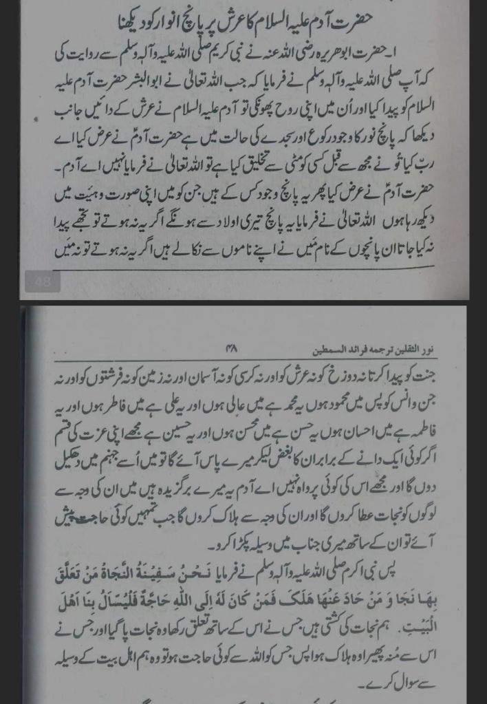 अल्लाह तआला ने फरमाया, “ये पाँच तेरी औलाद से होंगे। अगर ये न होते, तो तुझे पैदा न किया जाता। इन पाँचों के नाम मैंने अपने नामों से निकाले हैं। अगर ये न होते, तो न मैं जन्नत को पैदा करता, न दोज़ख को, न अर्श को और न कुर्सी को, न आसमान और न ज़मीन को, न फरिश्तों को और न जिन्न और इंसान को। पस मैं महमूद हूँ, ये मोहम्मद हैं; मैं आली हूँ, और ये अली हैं; मैं फातिर हूँ, और ये फातिमा हैं; मैं एहसान हूँ, ये हसन हैं; मैं मोहसिन हूँ, और ये हुसैन हैं। मुझे अपनी इज़्ज़त की कसम, अगर कोई एक दाने के बराबर इनका बुग़्ज़ लेकर मेरे पास आएगा, तो मैं उसे जहन्नम में धकेल दूँगा और मुझे इसकी कोई परवाह नहीं। ऐ आदम! ये मेरे बरगुज़ीदा हैं। मैं इनकी वजह से लोगों को निजात अता करूँगा और इनकी वजह से हलाक करूँगा। जब तुम्हें कोई हाजत पेश आए, तो इनके साथ मेरी जनाब में वसीला पकड़ा करो।”