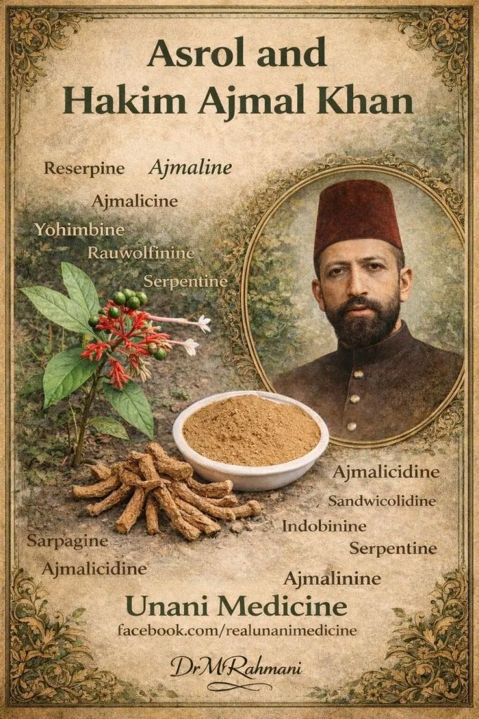 Hakim Ajmal Khan played a pivotal role in bridging traditional Unani medicine and modern scientific research in India. Although he was not a laboratory chemist himself, his visionary leadership laid the foundation for systematic scientific investigation of Unani drugs, including Rauwolfia serpentina (Asrol).