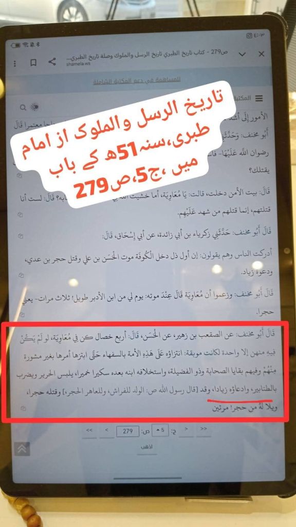 (Tareekh al-Rusul wal-Muluk — Imam Tabari, sanah 51 Hijri ka bab, jild 5, safha 279)