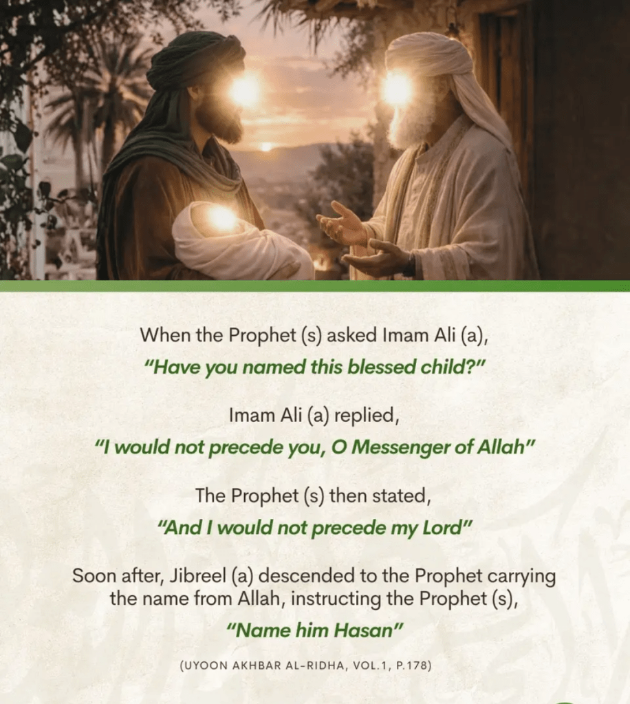 *2.* Hazrat Ali Alahis Salam Se Riwayat Hain Ke Aapne Apne Bade Shahzade Hazrat Hasan Ka Naam e Mubarak Hamza Rakha, Phir Huzoor Nabi e Kareem ﷺ Ne Unka Naam e Mubarak Hasan Rakha.