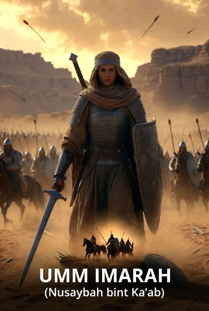 She was a brave woman. In the battle of Uhud she joined the Muslim army with her two sons: ‘Abdullah and Habib. She was to carry water to the Muslim soldiers but when the Muslims were trapped, she had nothing to do but to hold a sword in order to defend the Prophet (pbuh). She received in this battle about thirteen wounds. She remained treating these wounds for a year although she came out bleeding from the battle of Uhud, she went with the Muslim army to fight in the battle of Hamra’ al-Asad, which occurred immediately after the battle of Uhud.