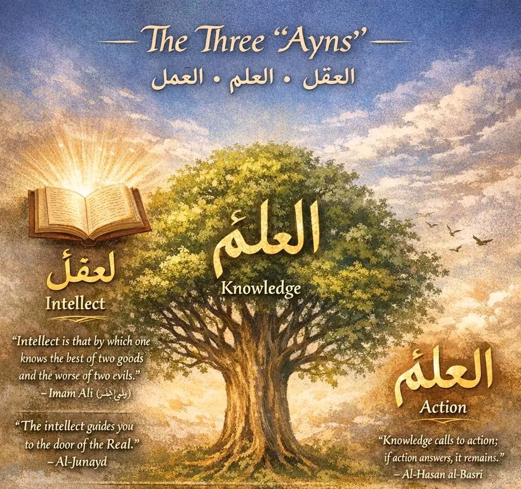 In the Islamic intellectual and spiritual tradition, three essential principles shape the path of a believer toward truth and closeness to Allāh: ʿAql العقل, intellect, ʿIlm العلم, knowledge, and ʿAmal العمل, action.