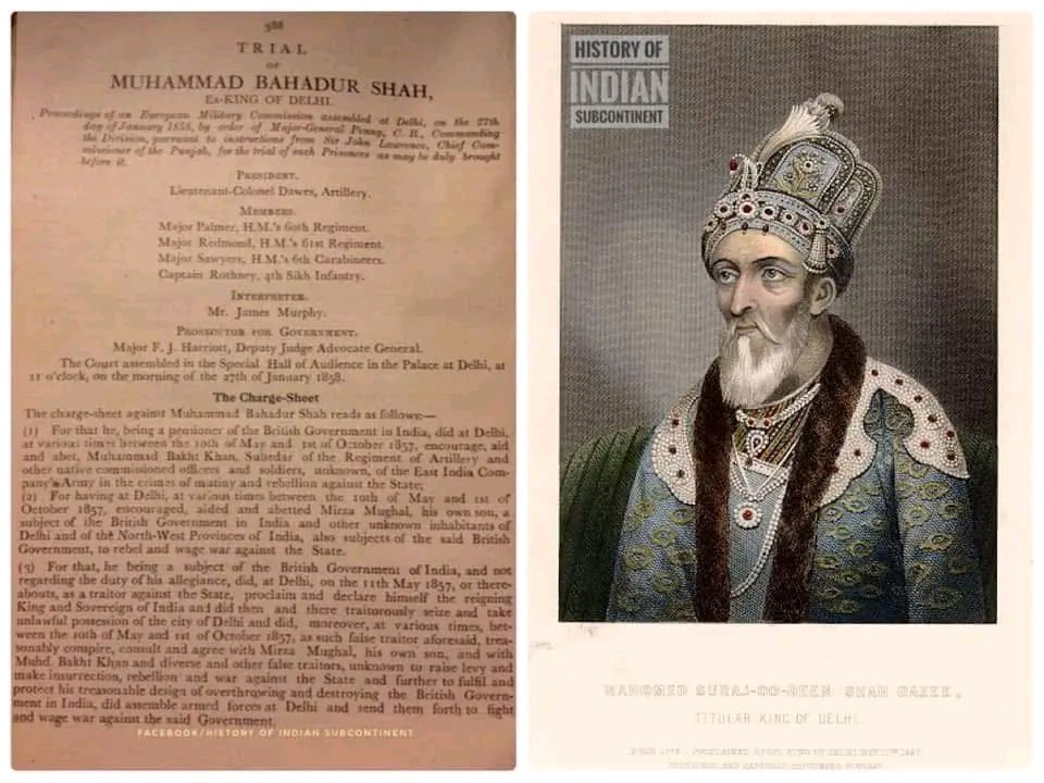 After the siege and later fall of Delhi a kangaroo court was established, to put on trial the most famous person of India, the king of Delhi, the last Mughal emperor. His crime was nothing apart from supporting a legitimate fight and resistance against an occupier, the most powerful empire of the time, ‘The British Empire’. His claim was legitimate; being the ruler of India he supported the Mutiny but denied any conspiracy against British Citizens of India. He accepted and treated every English man and woman of Delhi, as his own subject.