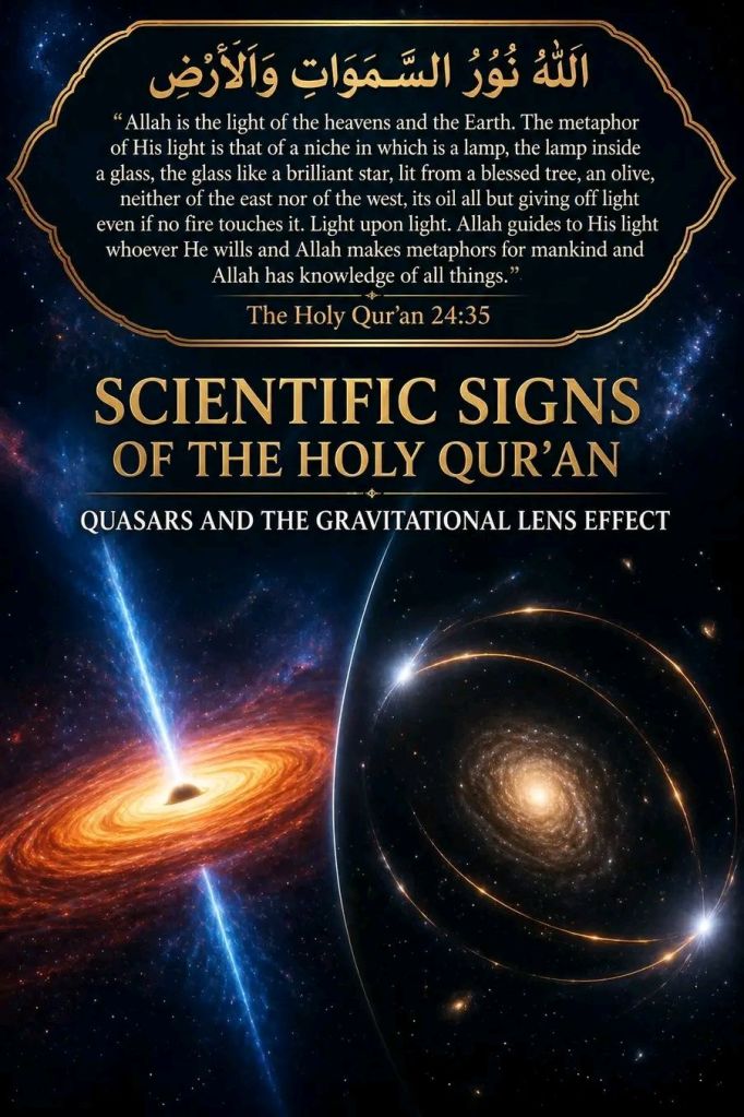 Quasars are extremely luminous and distant active galactic nuclei powered by supermassive black holes, appearing star-like while emitting enormous electromagnetic radiation, including radio waves (1,2). They are among the brightest known objects in the universe, with luminosities reaching up to ~10¹²–10¹⁴ times that of the Sun (3,4). Some quasars outshine entire galaxies such as the Milky Way by factors exceeding 100 (5). The Arabic word “noor” in the verse denotes light, radiance, and illumination, conceptually aligning with the extraordinary luminosity of quasars (6,7).