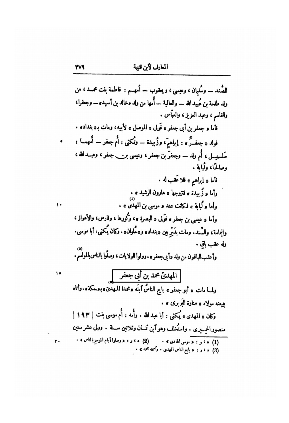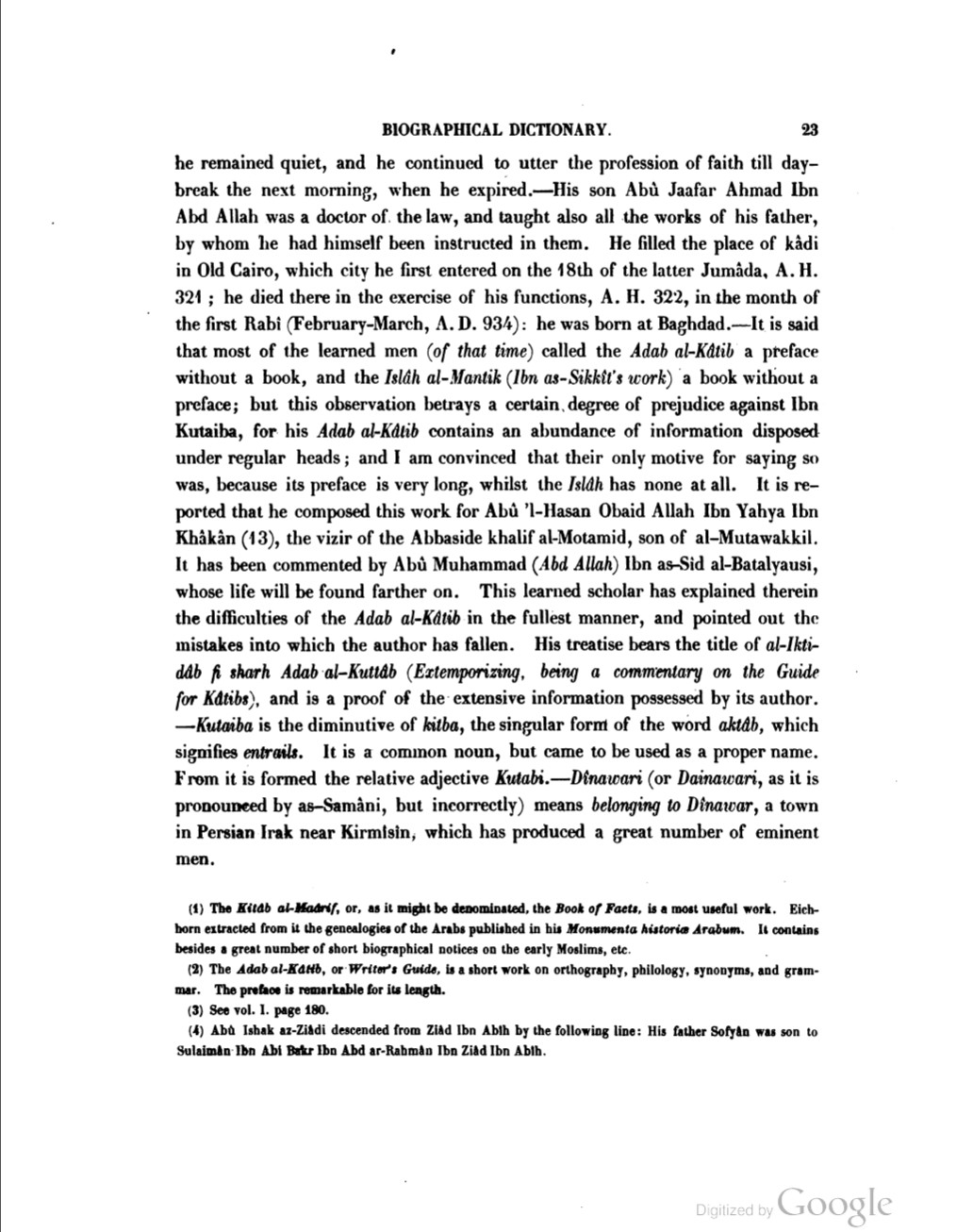 Abu Mohammed Abdullah Bin Muslim Ibn Qutaybah Ad-Dinawari (native of Dinawar), some say Al Marwazi (native of Marw)- the author of Kitab Al Maarif and the Adab Al Katib, was a grammarian and philologer of eminent talent and noted for the correctness of his information. Besides the works just mentioned he composed a number of others equally instructive such as his explanation of the rare expressions occurring in the Quran, Explanation of the rare expressions occurring in the Traditions, the (1) Uyun Al Akhbar, (2) The Mushkil Al Quran (Obscurities of the Qur’an), (3) The Mushkil Al Hadith (Obscurities of the Traditions), (4) The Tabakat As-Shuara (notices on the poets), (5) The Kitab Al Ashriba (treatise on the different sorts of drinks), (6) The Islah Al Ghalat (faults corrected), (7) The Kitab At-Takfih (the instructor), (8) The Kitab Al Khail (treatise on horses), (9) The Seven Readings of the Qur’an analyser Grammatically, a work on the Anwa, (10) The Kitab Al Masail, etc (Book of Questions and Answers), (11) The Kitab Al Maisir wa’l-Kidah (on games of chance).