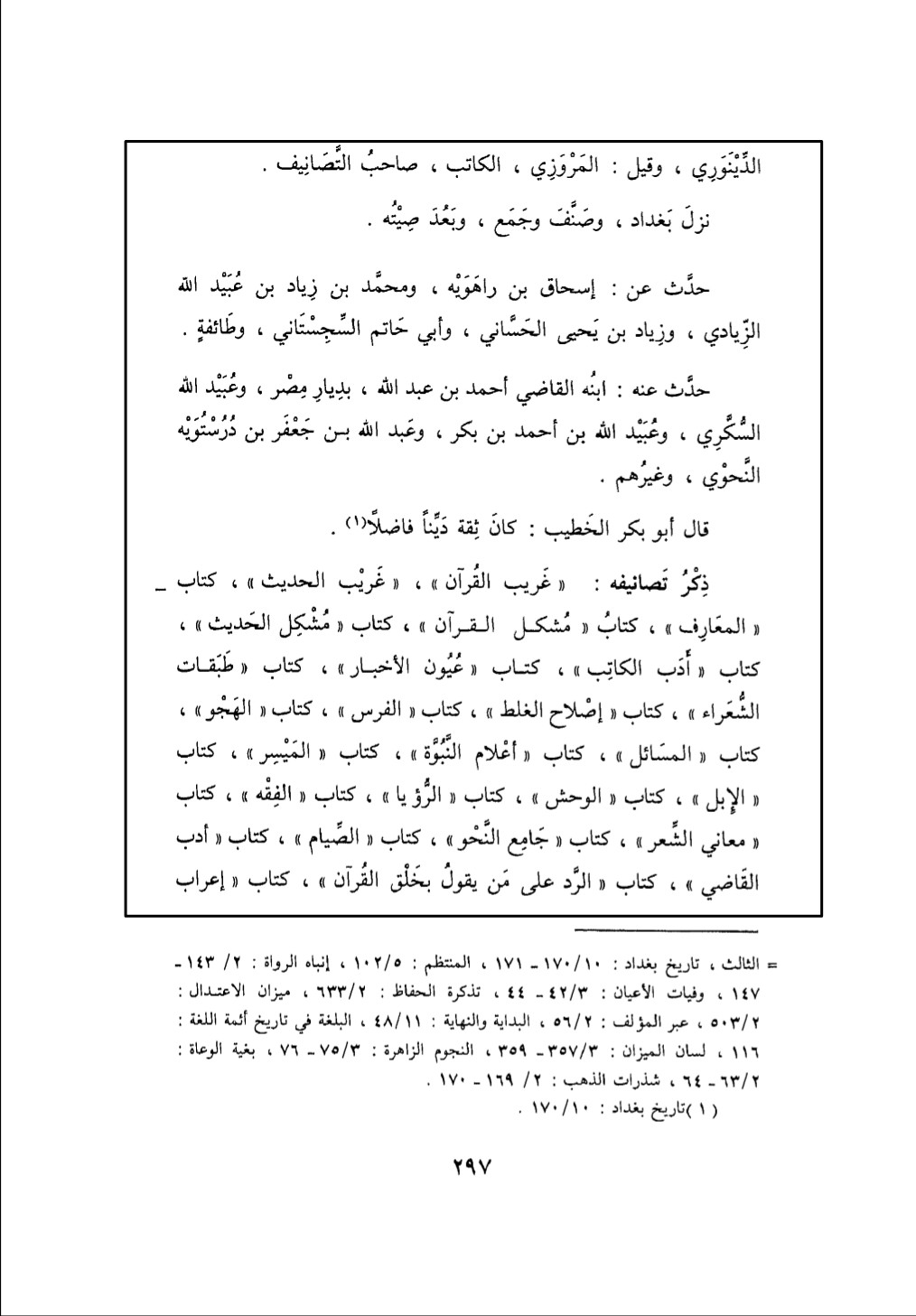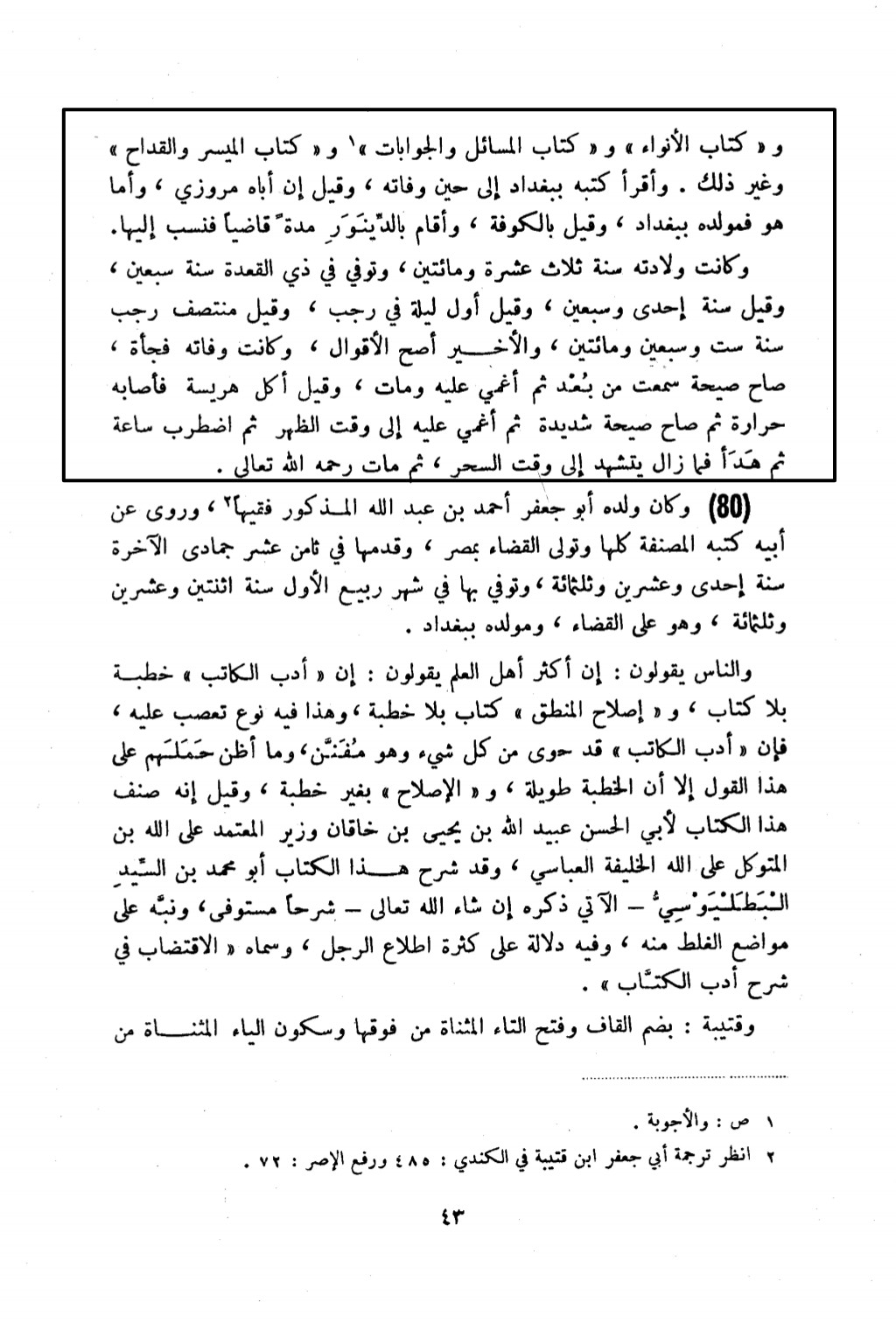 أبو محمد عبد الله بن مسلم بن قتيبة الدينوري، وقيل المروزي، النحوي اللغوي صاحب كتاب ” المعارف ” و ” أدب الكاتب….. وتصانيفه كلها مفيدة، منها ما تقدم ذكره، ومنها ” غريب القرآن الكريم ” و ” غريب الحديث ” و ” عيون الأخبار ” و ” مشكل القرآن ” و ” مشكل الحديث ” و ” طبقات الشعراء ” و ” الأشربة ” و ” إصلاح الغلط ” و ” كتاب التقفية ” و ” كتاب الخيل ” و ” كتاب إعراب القراءات ” و ” كتاب الأنواء ” و ” كتاب المسائل والجوابات ” و ” كتاب الميسر والقداح