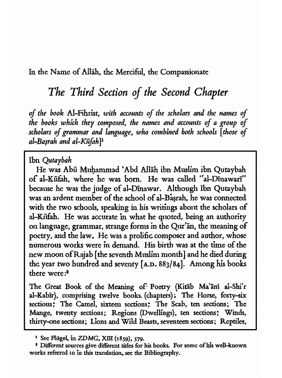 He was Abu Mohammed Abdullah Bin Muslim Ibn Qutaybah of Al kufa where he was born. He was called Al Dinawari because he was the judge of Al Dinawar. Although Ibn Qutaybah was an ardent member of the school of Al Basra, he was connected with the two schools, speaking in his writings about the Scholars of Al kufa. He was accurate in what he quoted being an authority on language, Grammar, Strange forms in the Quran, meaning of poetry, and the law. He was a profolic composer and author whose numerous works where in demand. His birth was at the time of the New Moon of Rajab [the seventh Muslim month] and he died during the year 270H. Among his books there were: