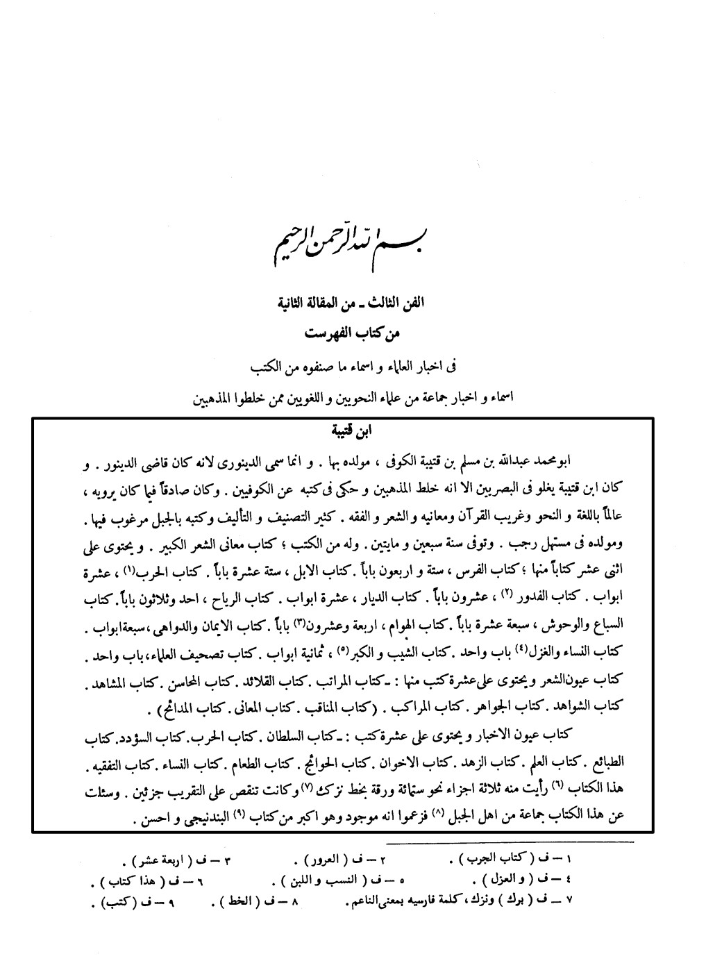 [1] ابن قتيبة: أبو محمد عبد الله بن مسلم بن قتيبة الكوفي مولده بها وانما سمي الدينوري لأنه كان قاضي الدينور1 وكان بن قتيبة يغلو في البصريين إلا انه خلط المذهبين وحكى في كتبه عن الكوفيين وكان صادقا فيما يرويه عالما باللغة والنحو وغريب القرآن ومعانيه والشعر والفقه كثير التصنيف والتأليف وكتبه بالجبل مرغوب فيها ومولده في مستهل رجب وتوفي سنة سبعين ومائتين وله من الكتب كتاب معاني الشعر الكبير ويحتوي على اثني عشر كتابا منها كتاب الفرس ستة وأربعون بابا كتاب الإبل ستة عشر بابا كتاب الجرب عشرة أبواب كتاب العرور عشرون بابا كتاب الديار عشرة أبواب كتاب الرياح أحدى وثلاثون بابا كتاب السباع والوحوش سبعة عشر بابا كتاب الهوام أربعة عشر بابا كتاب الإيمان والدواهي سبعة أبواب كتاب النساء والعزل باب واحد كتاب النسب واللبن ثمانية أبواب كتاب تصحيف العلماء باب واحد كتاب عيون الشعر ويحتوي على عشرة كتب منها كتاب المراتب كتاب القلائد كتاب المحاسن كتاب المشاهد كتاب الشواهد كتاب الجواهر كتاب المراكب كتاب عيون الاخبار ويحتوي على عشرة كتب كتاب السلطان كتاب الحرب كتاب السؤدد كتاب الطبائع كتاب العلم كتاب الزهدكتاب الاخوان كتاب الحوائج كتاب الطعام كتاب النساء كتاب التفقيه هذا كتاب رأيت منه ثلاثة أجزاء نحو ستمائة ورقة بخط برك وكانت تنقص على التقريب جزءين وسألت عن هذا الكتاب جماعة من أهل الخط فزعموا أنه موجود وهو أكبر من كتب البندنيجي وأحسن من كتبه كتاب الحكاية والمحكي كتاب أدب الكاتب كتاب الشعر والشعراء كتاب الخيل كتاب جامع النحو كتاب مختلف الحديث كتاب اعراب القرآن كتاب ديوان الكتاب كتاب فرائد الدر كتاب خلق الإنسان كتاب القراءات كتاب المراتب والمناقب من عيون الشعر كتاب التسوية بين العرب والعجم كتاب الأنواء كتاب المشكل كتاب دلائل النبوة كتاب اختلاف تأويل الحديث كتاب المعارف كتاب جامع الفقه كتاب إصلاح غلط أبي عبيد في غريب الحديث كتاب المسائل والجوابات كتاب العلم نحو خمسين ورقة كتاب الميسر والقداح كتاب حكم الأمثال كتاب الأشربة كتاب جامع النحو الصغير كتاب الرد على المشبهة كتاب آداب العشرة كتاب غريب الحديث