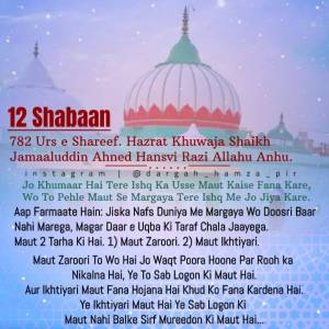 12 Shaban Ul Muazzam Yaum e Urs e Paak. Hazrat Khuwaja Shaikh Jamaal Uddin Ahmed Chishti Hansvi Razi Allahu Anhu.