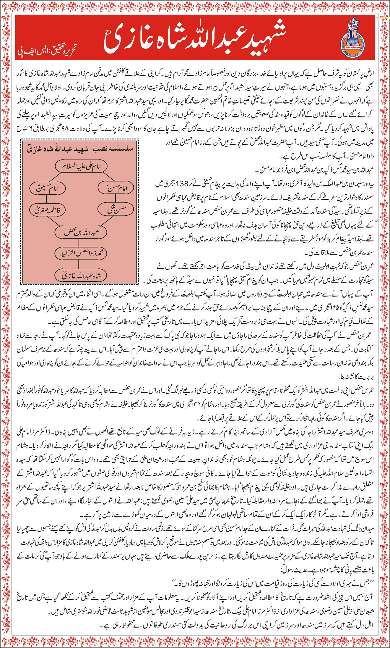 Abdullaah Shah Ghazi is one such revered personality who is not only very close to a Holy Masoom lineage wise (he is the fourth descendent of Imam Hasan (AS) and his tree is as follows: Abdullaah Al-Ashtar Ibn-e-Mohammad Nafs-e-Zakayya Ibn-e-Abdullaah Al-Mahaz – Ibn-e-Hasan Al-Muthanna Ibne Imam Hasan (AS).