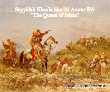 Khaula bint al-Azwar RA (Arabic خولة بنت الأزور) was a prominent woman during the life of the Islamic prophet Muhammad. Khaula bint al-Azwar RA was a Muslim Arab warrior, sister of Dirrar ibn Azwar, the legendary Muslim soldier and commander of the Rashidin army during the 7th century Muslim conquest. Born sometime in the seventh century, Khaula bint al-Azwar RA was well known for her leadership in battles of the Muslim conquests in parts of what are today Syria, Jordan, and Palestine. She fought side by side with her brother Dirrar in many battles, including a decisive Battle of Yarmuk in 636 against the Byzantine Empire. On the 4th day of the battle she led a group of women against the Byzantine army and was wounded during her fight with a Greek soldier.