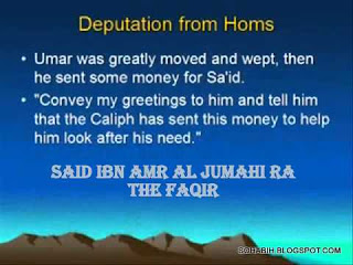 Saidina Umar Al Khattab RA appointed him as governor of Homs (Emessa) in Syria, which was then called little Kufah because, like Kufah, its inhabitants complained a lot about their leaders. During a visit to Syria, Saidina Umar Al Khattab RA asked the people of Homs if they had any complaints against their governor, to which they mentioned four. Saidina Umar Al Khattab RA summoned Said ibn Amir Al Jumahi RA, and in his presence asked the representatives of Homs to state their complaints.