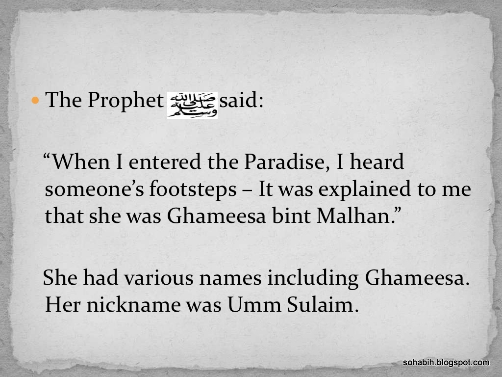 “When I entered the Paradise, I heard someone’s footsteps – It was explained to me that she was Ghumiysa’ bint Milhan.(Umm Sulaim RA)